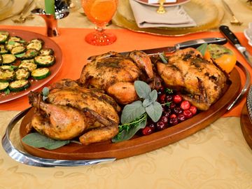 Your Choice of protein - Organic Turkey 10-12lbs., Herb Roasted Cornish Hens, 4lbs Salmon, Large Pan of Beef or Pork Ribs. Your Choice of 3 Sides: Herbed or Seafood Dressing, Garlic Green Beans or Stewed Green Beans with Smoked Turkey and Potatoes, Pan of 3 Cheese Mac and Cornbread