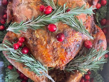 20lb. Organic turkey roasted with fresh herb compound butter, with your choice of 4 Sides: Herb Stuffing, Roasted Garlic Green Beans, or Stewed Green Beans with Smoked Turkey and Potatoes, Candied Yams, 3 Cheese Mac and Cornbread.
